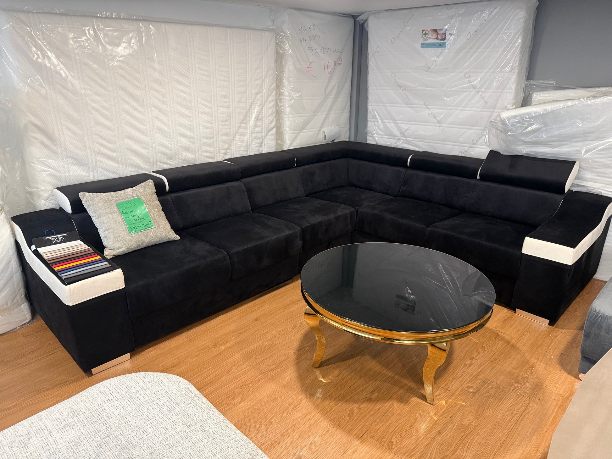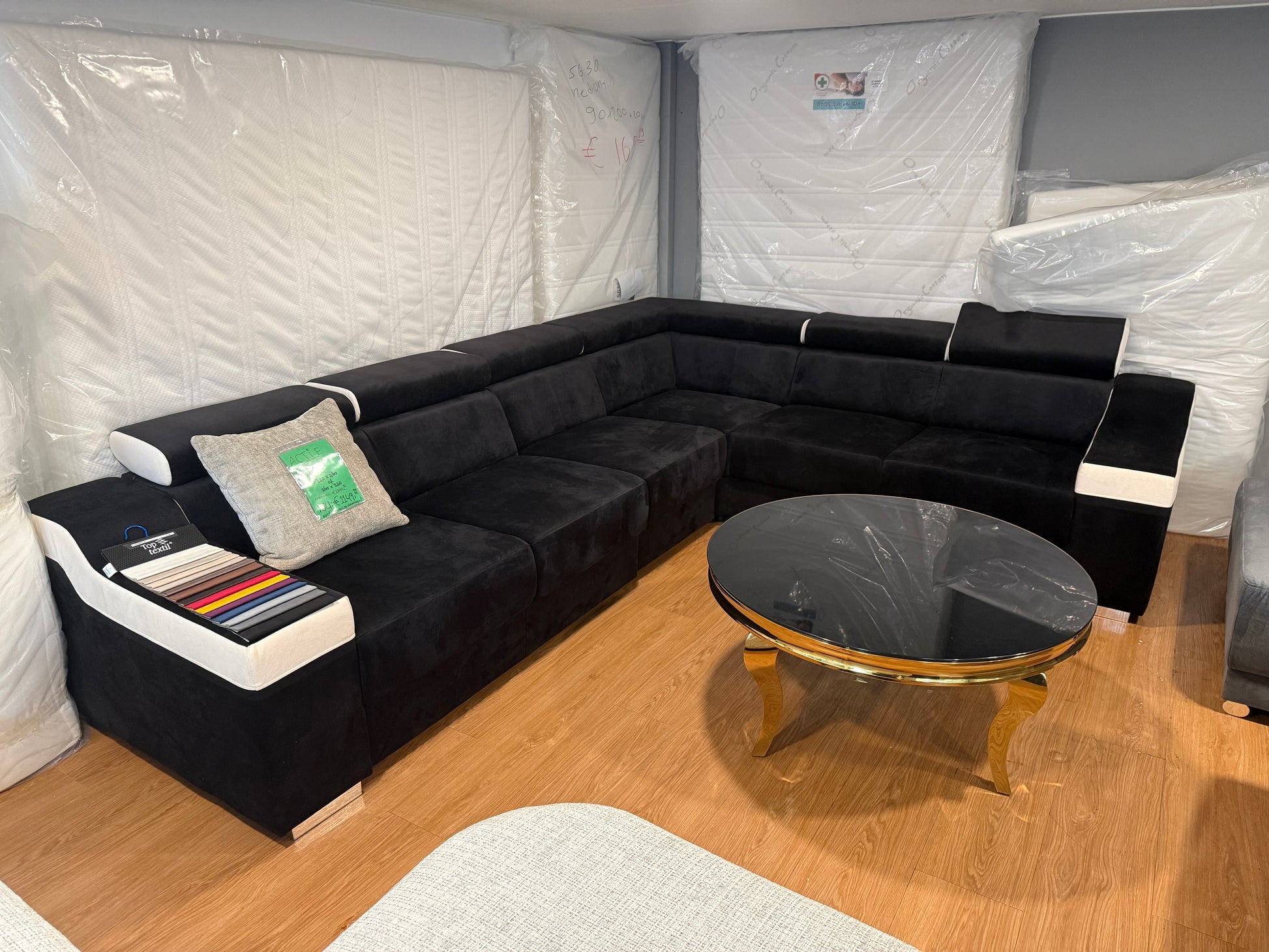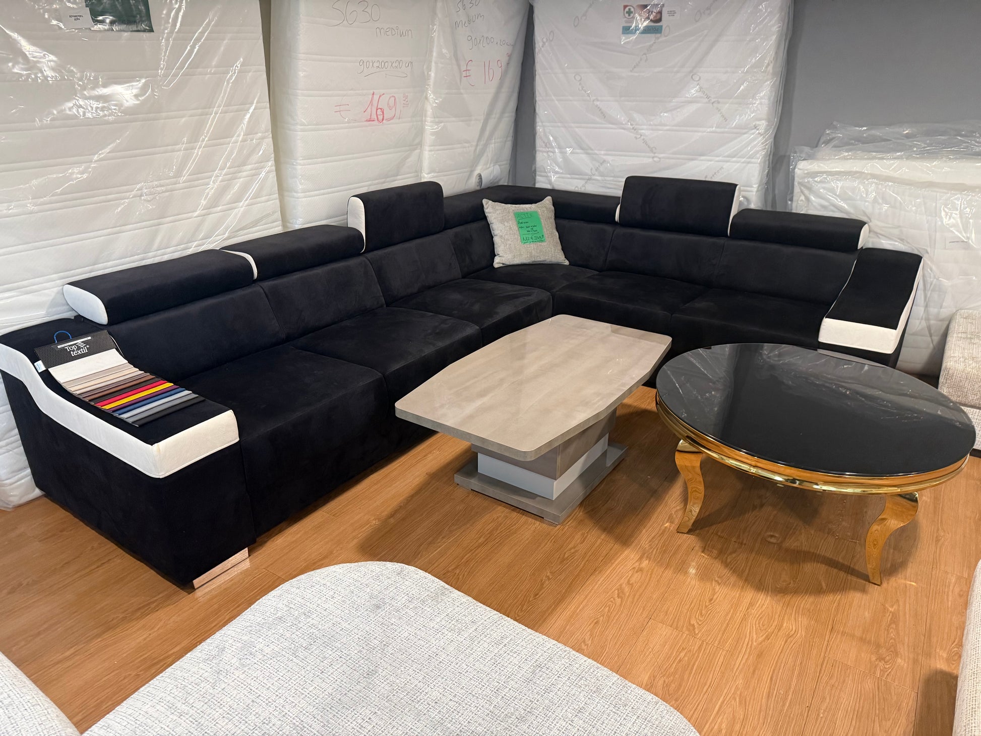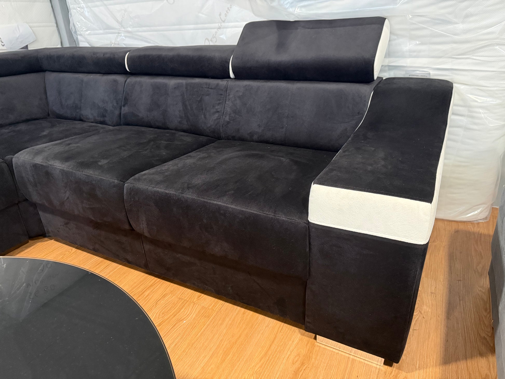 De Arizona is een stijlvolle hoekbank in zwart/witte stof, met verstelbare hoofdsteunen voor optimaal comfort. Met royale afmetingen van 265×330 of 330x265 cm biedt deze bank veel zitruimte, perfect voor ontspannen momenten. De zilveren poten geven de bank een moderne uitstraling en maken het geheel compleet.